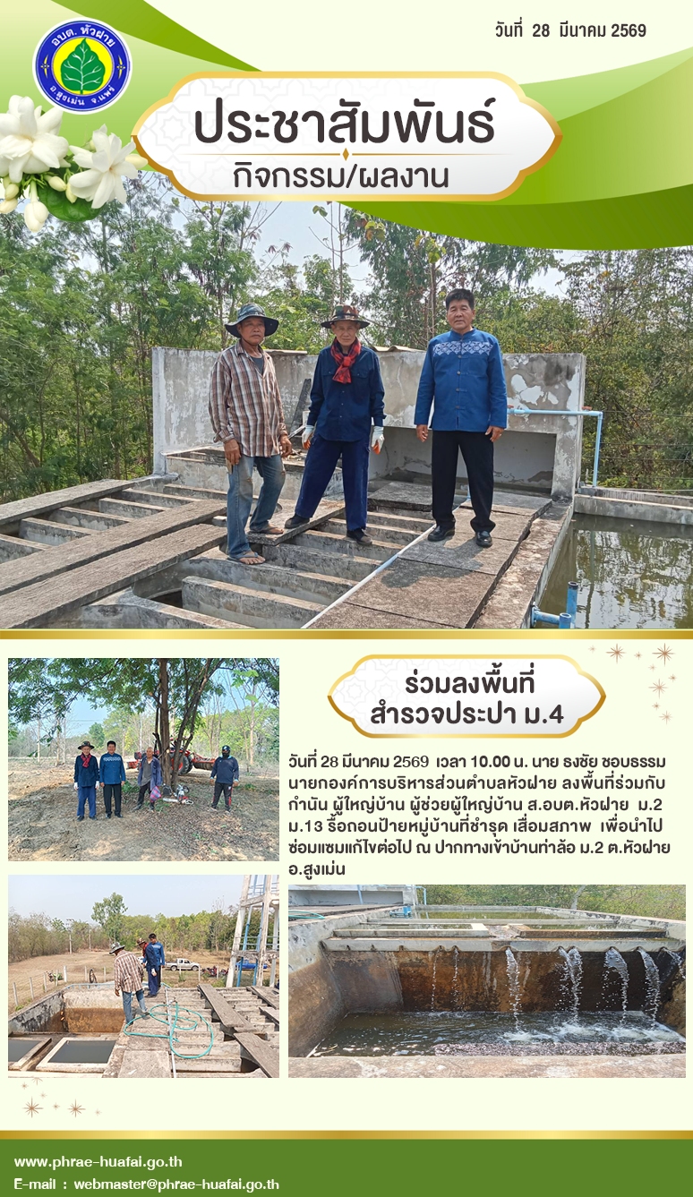 - ร่วมหารือแนวทางวางแผนการสร้างระบบผลิตน้ำของการประปาส่วนภูมิภาค ในพื้นที่ หมู่ที่ 4 ตำบล หัวฝาย (21 ม.ค. 68)